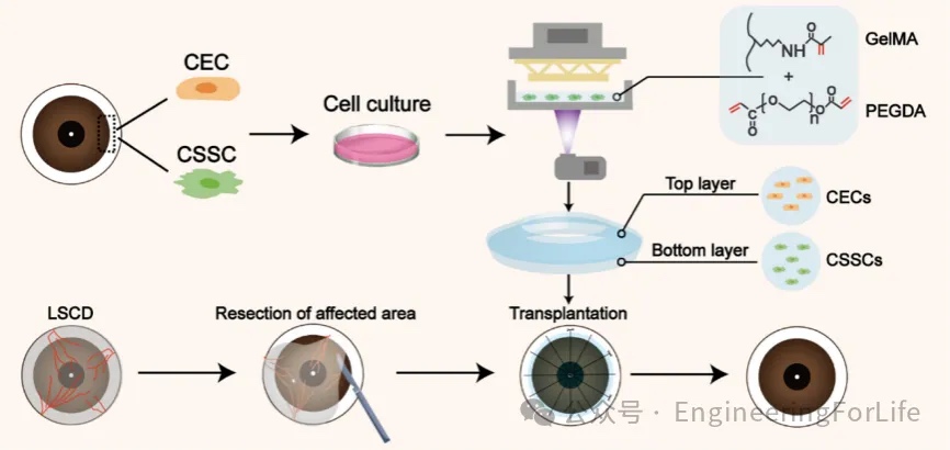 角膜缘干细胞缺陷(LSCD)会导致视力丧失,通常通过简单的角膜上皮细胞移植进行治疗,但长期效果较差。