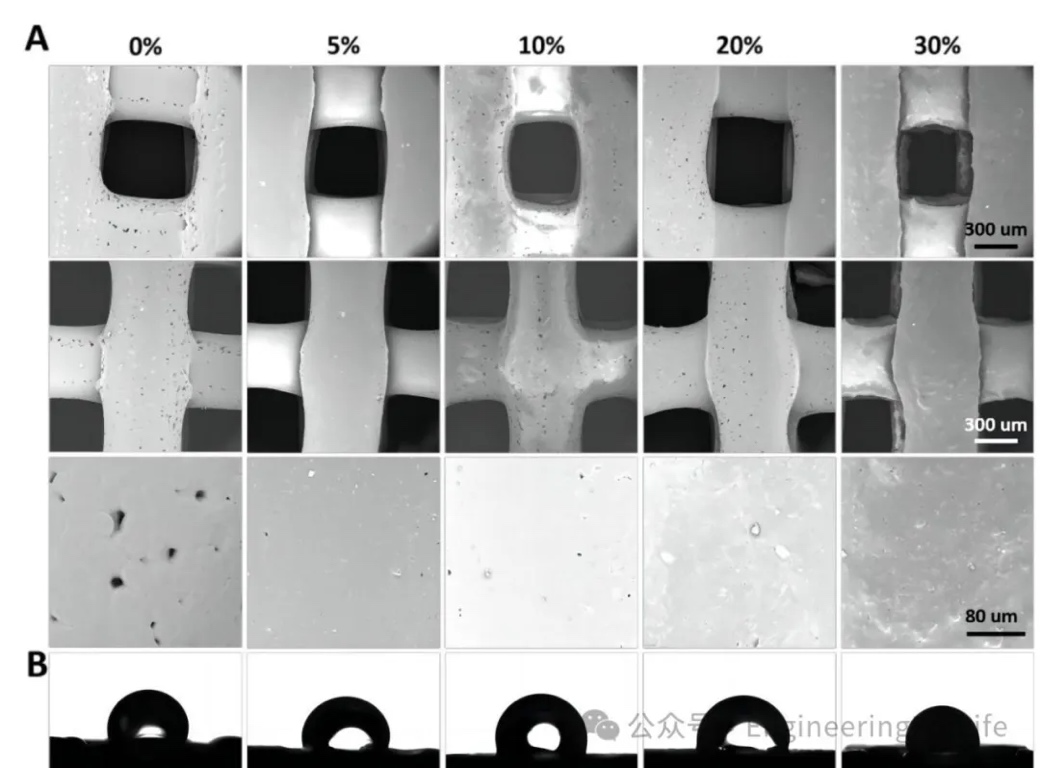各组支架丝径粗细均匀,纤维方向相差90°相互交错。支架表面存在散在孔隙,5MBG/PCL、10MBG/PCL、20MBG/PCL、30MBG/PCL支架表面可见MBG颗粒附着。从高倍镜下看,支架表面的粗糙度随着MBG含量的增加而增加,以30MBG/PCL最为显著。这些粗糙面可以为细胞提供粘附的位点,更有利于引导细胞增殖、分化等行为。此外,MBG的加入改善了PCL材料的亲水性,其改善程度与MBG浓度相关。