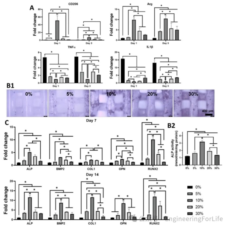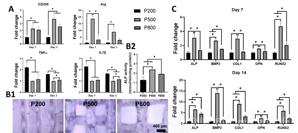 如图11所示,大孔径似乎更能促进MP向M2表型极化。相比P300,P500和P800显著上调CD206和ARG的表达,同时,第一天的ARG表达P500>P800,而其他情况下P500和P800无显著差异。P200诱导炎症基因(TNF-α、IL-1β)的表达最显著,P800次之,P500显示出显著的抑制效果。P200和P800促MP极化的能力弱于P500,这可能也是支架性能和细胞渗透未达到最佳平衡所致。在MP条件培养基的介导下,在各个时间点上,P500显著上调成骨基因的表达,P800的体外免疫成骨性能要优于P200。同样的,在ALP的染色和定量中,P500表现最显著的活性。