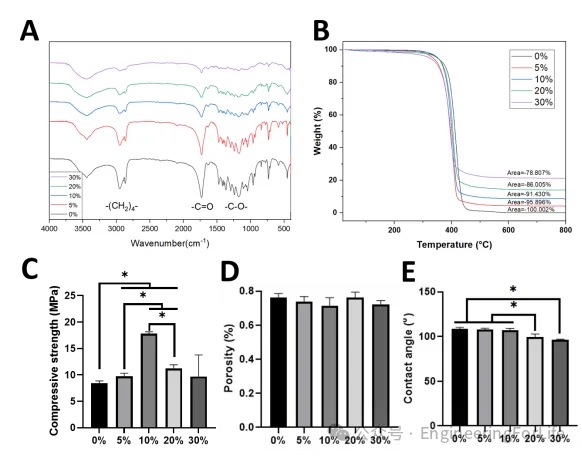 各组支架均出现PCL的特征峰,其中2850-3000cm-1处–(CH2)4–为CH伸缩振动,1750cm-1处是C=O伸缩振动峰,1150-1250cm-1代表-C-O-。随着MBG含量的增加,PCL原有的特征峰逐步降低。通过对各组支架进行热重分析,支架剩余无机颗粒的质量与混入MBG的比例基本一致。在支架的抗压缩性能测试中,我们可以看到随着MBG含量的增加PCL的抗压能力逐渐增强。以10%最显著。但在此基础上,随着MBG含量的增加支架的抗压强度逐步下降。20%和30%支架在达到抗压峰值后迅速坍塌。这是因为PCL包裹MBG颗粒类似于“海-岛”结构。我们推测,当MBG(“岛”组分)含量进一步增大时,对PCL(“海”组分)的整体连接性能产生了不利的影响,进而降低支架的最大抗压强度。同时,较大比例的MBG在PCL中团聚,使得抗压形变过程中受力不均导致支架整体坍塌。
