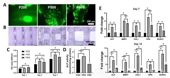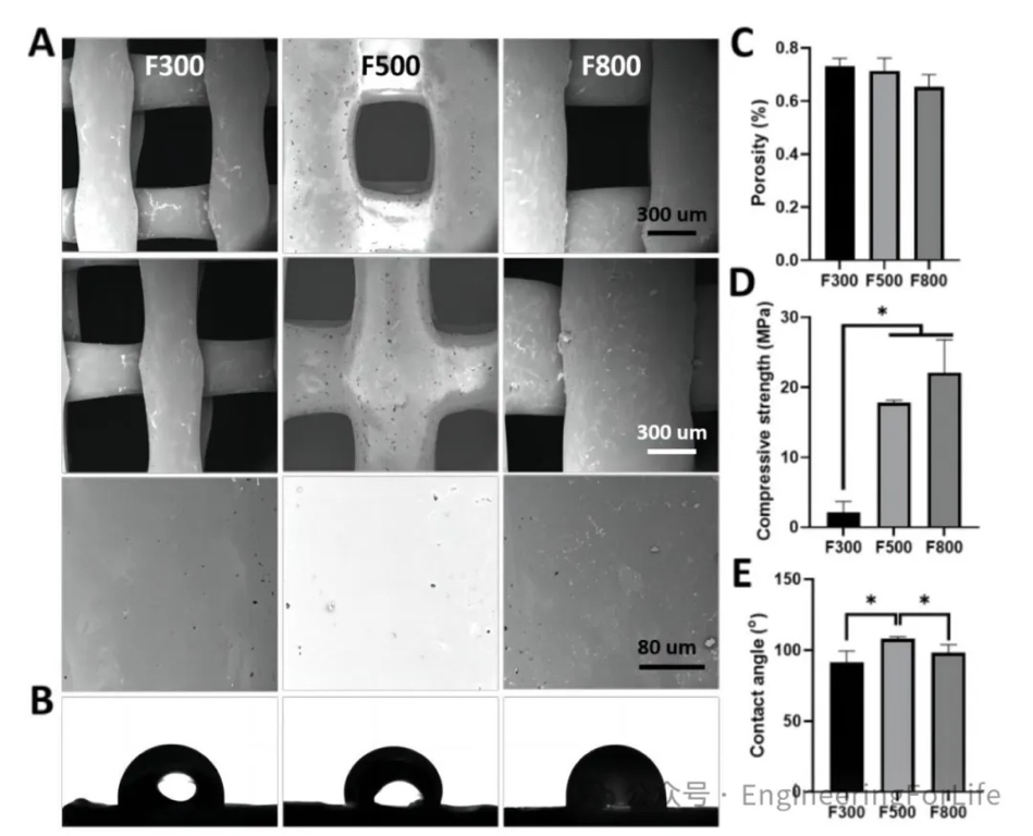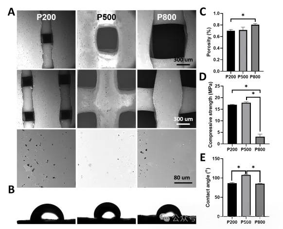 打印统一纤维直径500um,不同孔径(200um、500um、800um)的支架,分别标记为P200、P500、P800。P500的接触角最大,而P200和P800的接触角无显著差异。支架的孔径越大孔隙率越高,同时,支架的抗压强度随着孔径增大而下降。这可能是孔径的增宽降低了支架的受力面积,进而导致抗压能力的减弱。