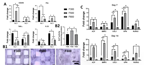 在炎症基因的表达中,较粗的纤维和较大的孔径似乎更有利于细胞外基质的分泌和沉积,倾向于修复表型M2基因(CD206、ARG)的表达。F500显著抑制了M1型基因(TNF-α、IL-1β)的表达,F300却显著上调M1型基因,然而在第3天的TNF-α表达中F800>F300。然而,F300诱导MP极化为M2的性能要优于F800,这可能是同等面积下,F300的纤维交叉较多,有利于MP的拉伸,促进M2极化。在MP条件培养基的介导下,在各个时间点上,F500促进成骨基因(ALP、OPN、BMP-2、COLI)的表达上调最为显著。在RUNX2的表达中,第7天F500显著高于F800,与F300无显著差异。第14天,F300优于F800,但F500与其余两组未表现出差异。F300和F800在ALP的染色和定量中未出现显著差异,F500能显著的促进ALP分泌。总的来说,在免疫调控成骨性能上,F500>F300>F800。