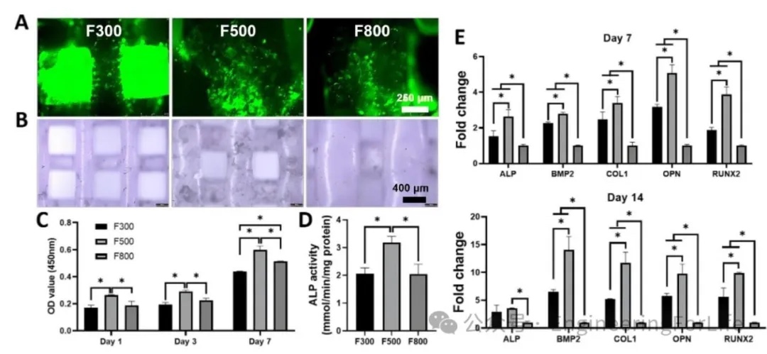 以10MBG/PCL支架为模板设定3D打印参数。打印统一孔径500um,不同纤维直径(300um、500um、800um)的三组支架,分别标记为F300、F500、F800。支架的亲水性和抗压强度以F500最佳。当纤维直径减少200um,支架的抗压性能则降低15.72MPa。纤维直径增加300um,支架的抗压性能则上升4.28MPa。更粗的纤维增加了支架的受力面积,因此整体表现为支架的抗压能力随着纤维的增粗而增强。三组支架的孔隙率则与抗压性能相反,相比F500,F300的孔隙率增加1.73%,而F800则下调了6.06%。