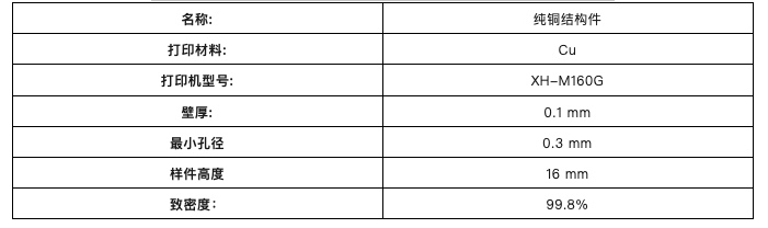 目前,希禾增材推出的绿激光金属3D打印设备(XH-M100G、M160G、M350G、M660G)已能实现纯铜零件的高质量打印,打印件致密度高达到99.8%~99.9%,热导率可达390 W/m·K。此外,使用绿激光设备打印的散热及换热部件,在0.5 mm壁厚下可承受超过8 MPa的水压,TPMS散热结构的最薄壁厚更低至0.08 mm。这些优异的技术指标已在航空航天、新能源汽车、半导体散热器件、感应加热线圈和高速通讯器件等多个领域得到成功验证。