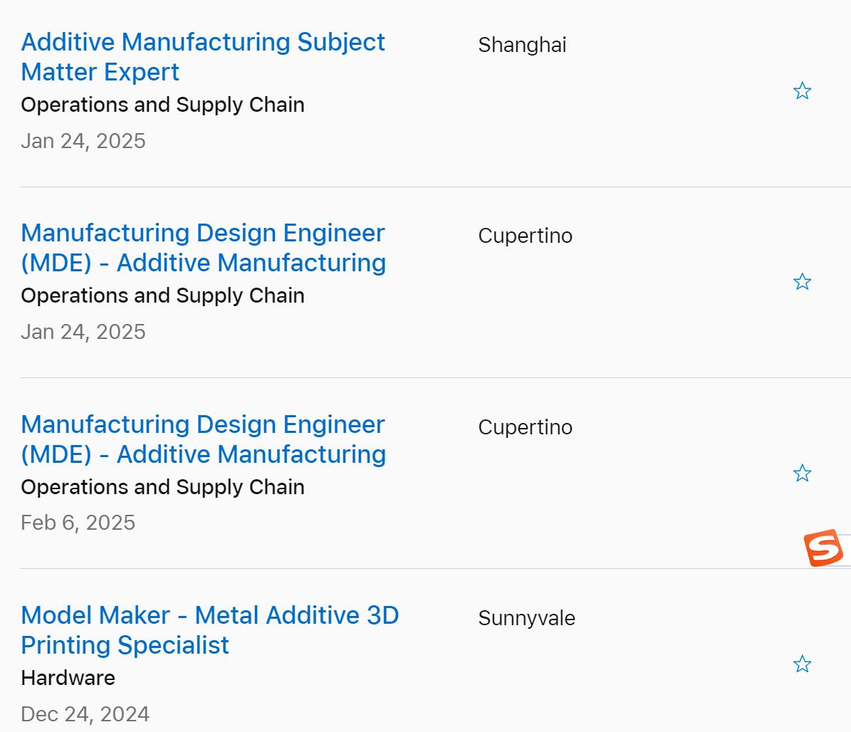 而且,很有趣的是,南极熊发现,铂力特和华曙高科这一轮大涨的启动时间,大概是2025年1月23日左右。而2025年1月23日,苹果公司在官网上正式发布了关于金属3D打印人才的招聘。一看就知道是3C电子产品要采用金属3D打印工艺的趋势。基本工资可高达18万美元。