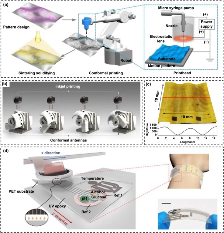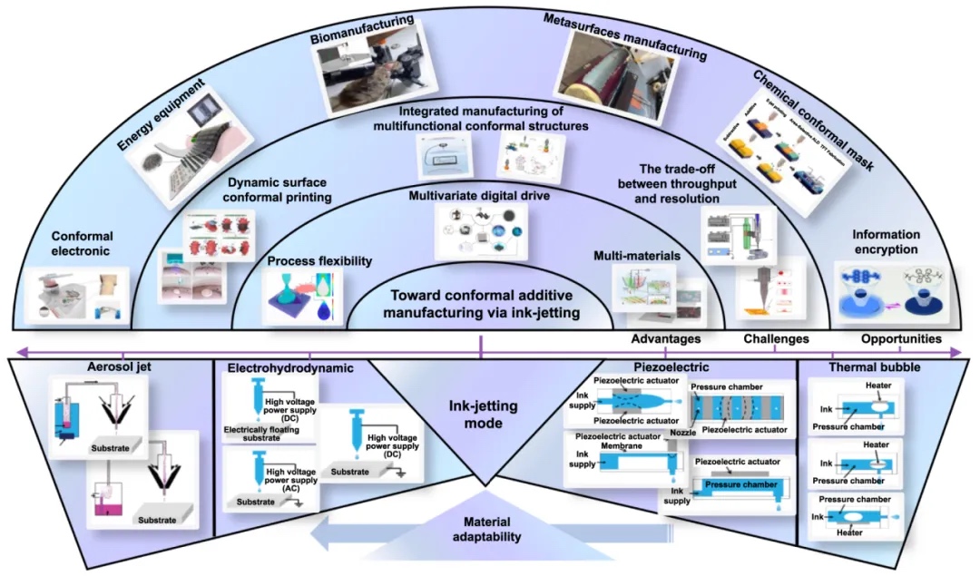 基于喷墨的随形增材制造因其独特的优势,在保形电子、能源设备、生物制造和超表面制造等新兴技术领域具有无限潜力。