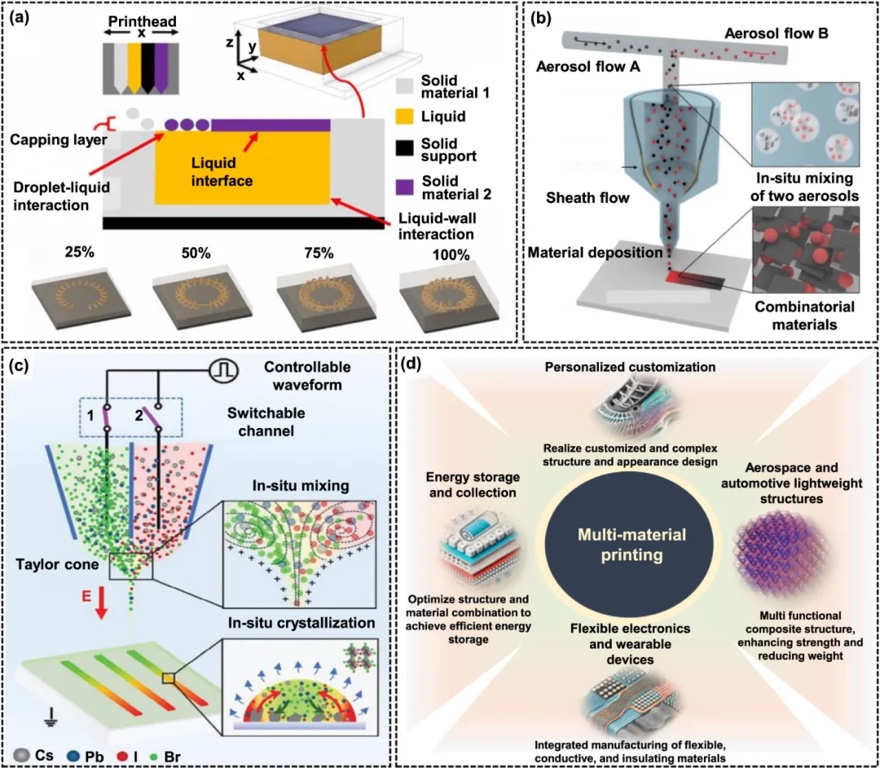 原位混合:通过精确控制墨水喷射比例和混合方法,喷墨打印可在微尺度上实现材料梯度成分的制造,满足功能梯度材料的需求。例如,气溶胶喷射打印允许在打印过程中实时调整材料混合比例,为制造高性能薄膜和多功能结构提供了可能(如下图b)。