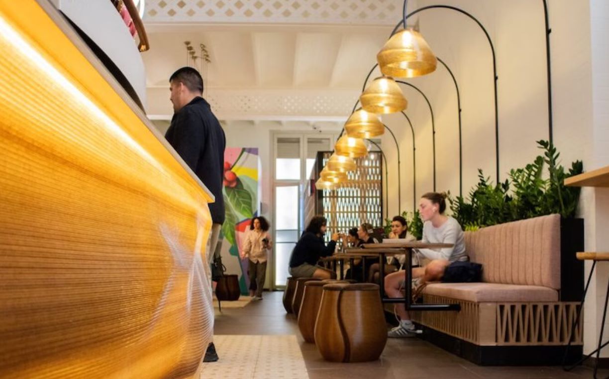 △采用 LOWIMPACT 材料制成的 3D 打印酒吧、凳子和灯具