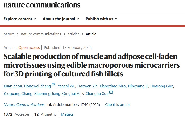 2025年2月23日,来自中国海洋大学食品科学与工程学院的研究人员开发出了一种可扩展的方法,利用可食用多孔微载体(EPM)和生物打印技术生产实验室培育鱼片。相关研究以题为“Scalable production of muscle andadipose