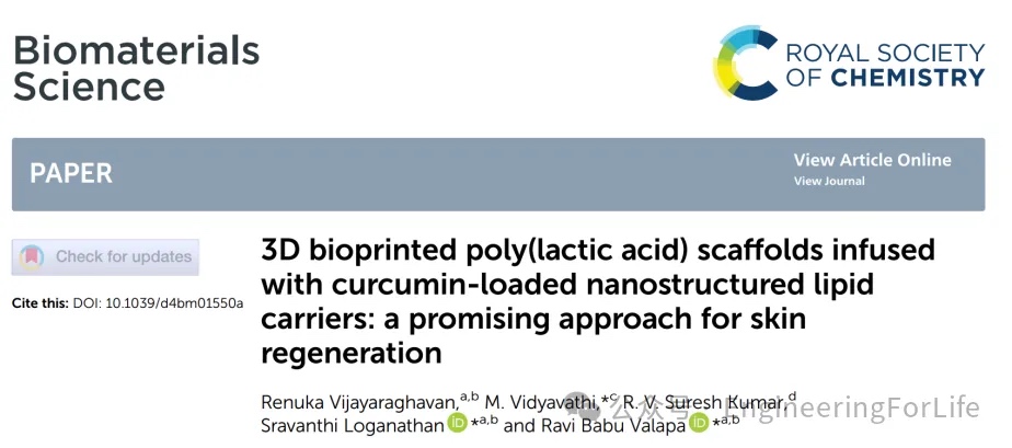 Vidyavathi等制备了一种基于3D生物打印的聚乳酸(PLA)支架,该支架内嵌载有姜黄素的纳米结构脂质载体(CNLC),用于皮肤再生和伤口愈合的研究。