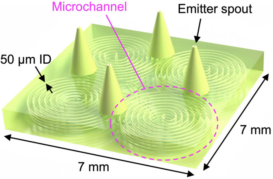 静电喷射引擎通过微流体通道将推进剂输送至发射器阵列。发射器尖端的静电场产生电流体动力学效应,将液体塑造成锥形液面,喷射带电高速液滴产生推力。发射器尖端专为低电压电流体动力学喷射设计,需要精确的锐度。为调节液体流动,该装置包含一个将推进剂输送通过通道的液压系统。发射器阵列由八个模块组成,每个模块有四个发射器作为互联系统协同工作。