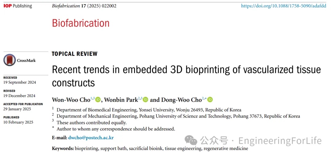 Cho团队概述了在嵌入生物打印中使用的各种材料,研究了使用嵌入式生物印刷技术的血管化组织构建体生物生物制造的当前研究趋势以及局限性。