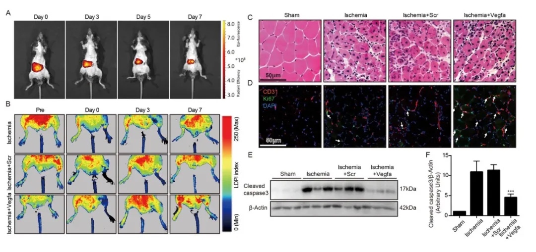 为探究载细胞微粒的临床应用价值,我们建立小鼠下肢缺血模型并移植VEGF-A载细胞微粒,发现相较对照组,移植了载VEGF过表达细胞微球的小鼠下肢缺血坏死症状得到显著改善,大幅缩短肢体功能恢复时间