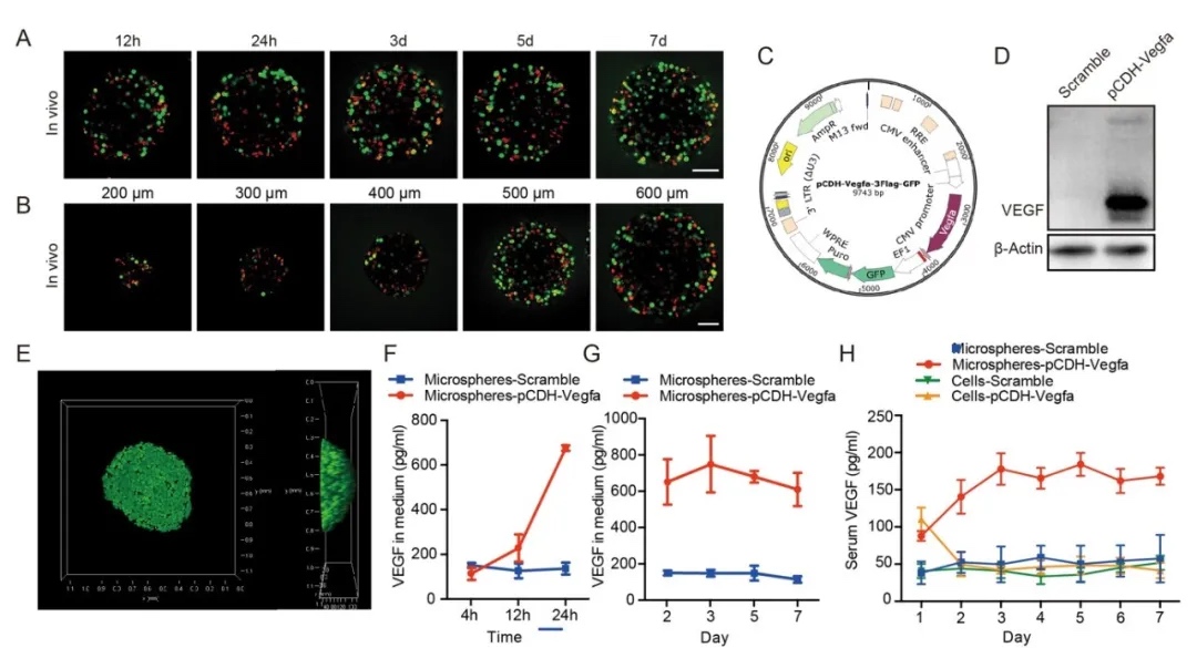 是否有可能结合这两种治疗手段的优点,开发出将稳定释放促血管新生细胞因子的细胞移植入体内并免疫豁免的新方法?有没有可能将这一过程标准化、量产化从而使之具有广泛应用的潜能?浙江大学附属第二医院项美香教授课题组和贺永教授课题组合作,通过生物3D打印功能化的载细胞微球,将稳定过表达释放促血管新生细胞因子VEGF-A的HEK293T细胞包裹至直径200-600微米的微球内,并将其用于在体下肢缺血治疗(如图一)。