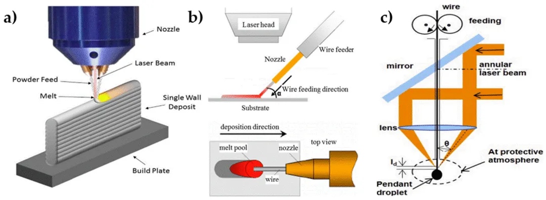 图2展示了三种类型的激光直接能量沉积(LDED)的机制。图2a展示了使用金属粉末的激光直接能量沉积的机制。金属粉末和丝材原料都可用于激光直接能量沉积。金属粉末通过喷嘴输送到表面,激光束将其逐层熔化并形成三维物体。相比之下,使用丝材原料的激光直接能量沉积是将金属丝送入基底并与激光接触。在基底上形成熔池,金属丝被送入并熔化,形成冶金结合。凝固后,通过控制激光与基底之间的相对运动形成焊道,然后通过连续的送丝、熔化和沉积过程创建三维物体。相比之下,金属丝的储存比金属粉末更安全、更简单。然而,熔化金属丝通常需要更高的激光功率,这导致基于丝材的激光直接能量沉积系统的设备成本更高。图2b展示了使用侧向送丝机制的激光直接能量沉积示意图,送丝器从侧面输送金属丝。图2c展示了同轴送丝机制,金属丝在打印装置内送入。