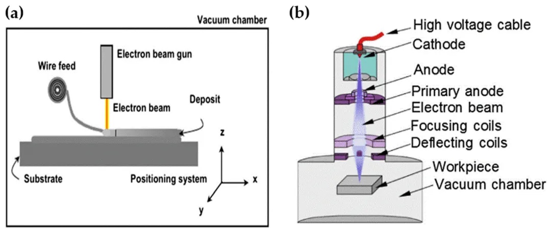 图3a展示了电子束直接能量沉积(EB-DED)的机制。一般来说,电子束直接能量沉积采用与激光直接能量沉积类似的机制来制造三维结构。电子束枪用作热源,并且需要真空环境。高真空环境有利于创造污染较少的气氛,并处理钛等活性金属。然而,真空环境可能会给原位监测带来挑战,从而限制了实现制造过程的闭环控制。图3b展示了电子束装置或枪的示意图。