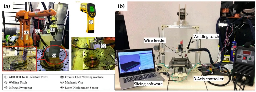 通常,焊枪安装在机械臂上实现三维金属打印过程,如图5a所示。由于工业机器人成本高昂,且电弧增材制造机制具有高度灵活性,研究人员甚至将焊枪与便携式XYZ移动平台集成在一起,如图5b所示。