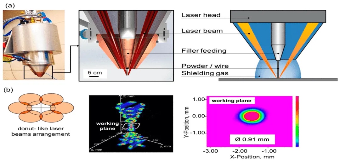 制造方法:班巴赫(Bambach)等人提出了一种六光束直接二极管激光直接能量沉积装置,如图7所示。六光束直接二极管激光定向能量沉积打印头安装在工业机器人上,最大激光功率为1千瓦。六束激光在打印头内部产生,并通过准直器和聚焦透镜直接传输到基底和材料上,无需光纤。采用轴向送料机制输送送料材料,通过耐热装置对热丝打印测试进行预热。这种设计的一个亮点是,由于单个激光束可调节且采用同轴送料方式,能够实现更简单的制造过程。与传统的激光定向能量沉积系统相比,该系统可确保保护气体的保护效果,而传统系统中气流的紊流会导致氧化积累。