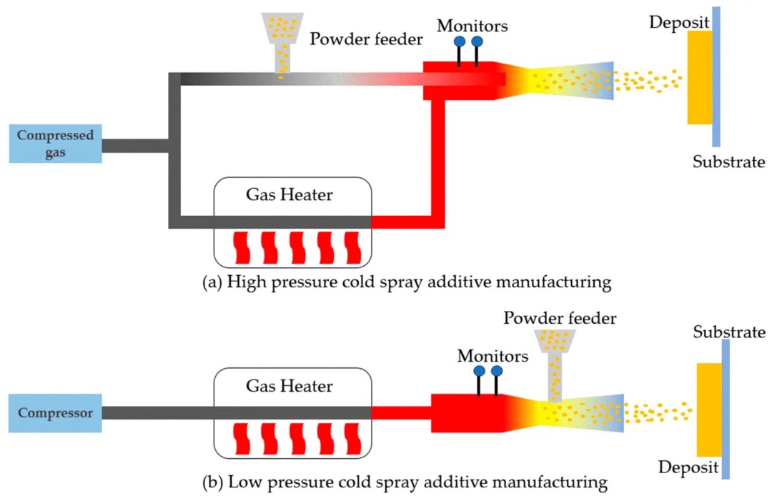 图6b展示了一个低压冷喷涂增材制造系统。通常使用便携式气体压缩机,而非压缩气体。金属粉末的注入位置靠近喷嘴的扩张段,由于局部气体压力较低,金属粉末可以释放到气流中。相比之下,低压冷喷涂增材制造系统成本更低且更具实用性。