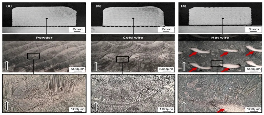 图8展示了长方体样品。由于实验中使用了粉末,粉末打印的样品出现了氧化现象。相比之下,冷丝和热丝打印的样品表面有光泽。如图9所示,三种样品的横截面图像显示出打印质量坚固且优良,单道轨迹之间以及与基底材料之间的结合没有缺陷。
