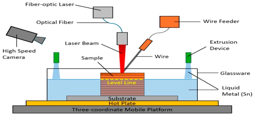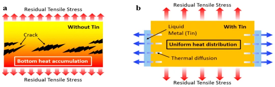 液态金属辅助直接能量沉积工艺的一个关键亮点是在金属沉积过程中增强了实时温度和应力控制。这种能力对于确保最终产品的结构完整性至关重要。液态锡的加入带来了显著的改善。这种机制有效地在样品和液态锡之间传递热量,降低了样品的峰值温度。
