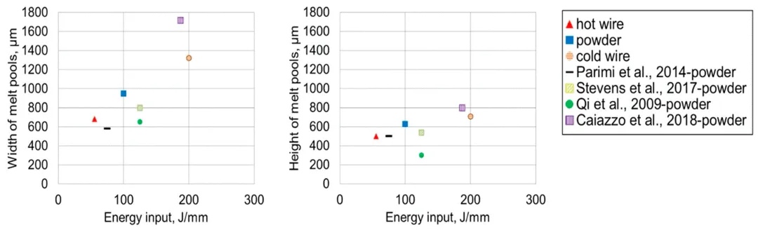 根据图10,在制造过程中使用热丝会使熔池尺寸更小。随着能量输入的增加,熔池尺寸会增大。预热后的丝材比冷丝或粉末所需的打印能量更少,因此能够更精确且更节能地完成增材制造过程。因此,预热丝材可减小熔池尺寸并提高打印分辨率。