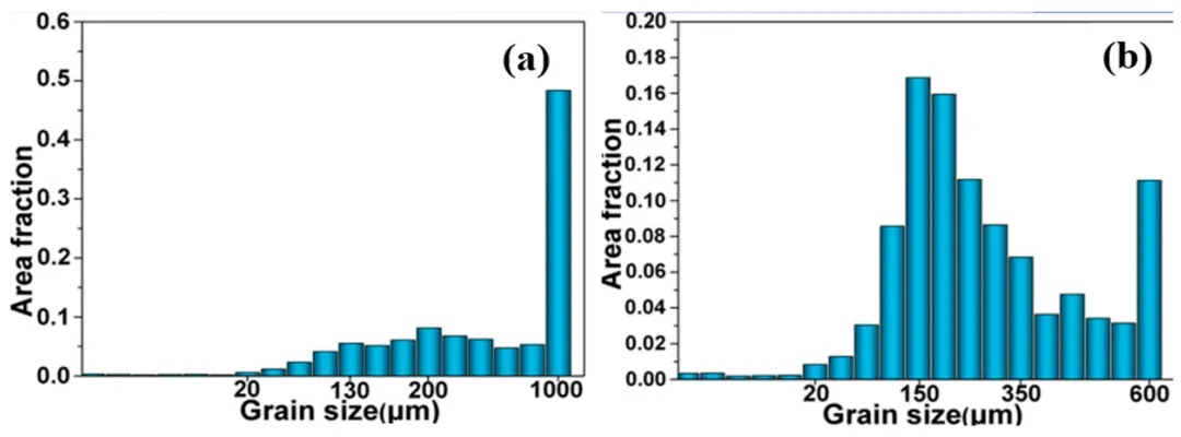 如图14所示,锡的使用使沉积物中的晶粒尺寸更细(约150微米,而无液态锡辅助时为200微米),其特征是交错的篮状和层状结构,且没有可见的裂纹。这是因为在引入锡后冷却速率提高了,因为更高的冷却速率为晶粒细化提供了更多的畸变能。微观结构中更细的晶粒也使显微硬度提高了约30%,这与霍尔-佩奇理论相符。
