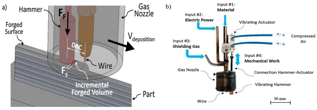 图15显示,一个由振动驱动器驱动的锤子安装在气体保护罩内,并且可以在不同频率下工作。锤子随着焊枪移动时,会撞击高温下沉积的层。锤子通过高电阻连接与电源相连,这在它接触已制造的样品时限制了电流的流动。这个定制的电弧增材制造焊枪安装在一个带有预设工作区域的移动头上。使用PRO