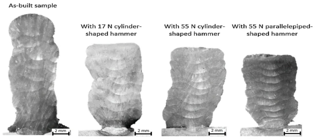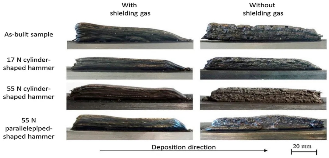 图16展示了使用不同的锤子锻造力、锤子形状和保护气体流量打印的样品。没有气体保护的样品显示出更多的孔隙,并且当不施加锤击力时,在基底和第一条轨迹之间观察到了翘曲。相比之下,有气体保护的样品表面光洁度更好。