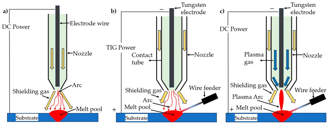 图4a-c展示了三种类型的电弧增材制造(WAAM)机制:熔化极惰性气体保护焊(MIG)、等离子弧焊(PAW)和钨极惰性气体保护焊(TIG)。与常见的增材制造工艺相比,MIG因其与焊接设备相连的连续焊丝卷而成为一种更便于用户操作和使用的方法,而TIG和PAW则需要额外的送丝设备。MIG使用消耗性的焊丝电极,沉积速率高,但牺牲了精度。另一方面,TIG使用非消耗性的钨电极,并通过外部送丝。这导致过程更为复杂,但能够实现更好的控制和更高的精度。PAW也使用非消耗性的钨电极,但其不同之处在于其更集中且强烈的等离子弧。这种强度使其能够对热输入和熔池进行最精细的控制,在这三种方法中精度最高。