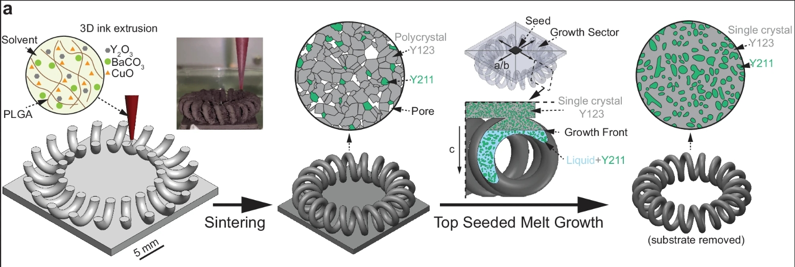 YBCO是一种广泛应用于医疗成像、能源研究以及磁悬浮交通等领域的高性能超导材料。然而,传统的单晶YBCO超导体由于具有脆弱性,在成型过程中仅限于简单的形状,如圆柱体或块体。而现有的3D打印技术虽然能够制造形状复杂的多晶YBCO超导体,但它的晶界较弱,限制了电流的承载能力。为了解决这一挑战,西北大学和费米实验室的研究人员开发了一种独特的两步工艺。该工艺首先利用3D打印技术制造出多晶结构的YBCO,随后通过一个精密的后处理步骤将这些多晶材料转化为单晶,同时保留了材料本身的优异电学性能和复杂的几何设计能力。