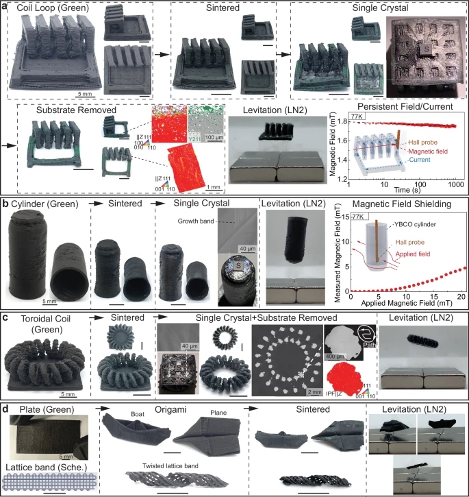 为了证明该方法的实用性,研究团队3D打印了多个复杂的超导结构,包括悬浮环形线圈、磁屏蔽管和折纸设计。这些结构若使用传统单晶生长技术几乎无法制造。它们的应用潜力包括粒子加速器、同步加速器波荡器和用于暗物质轴子搜索的微波腔。