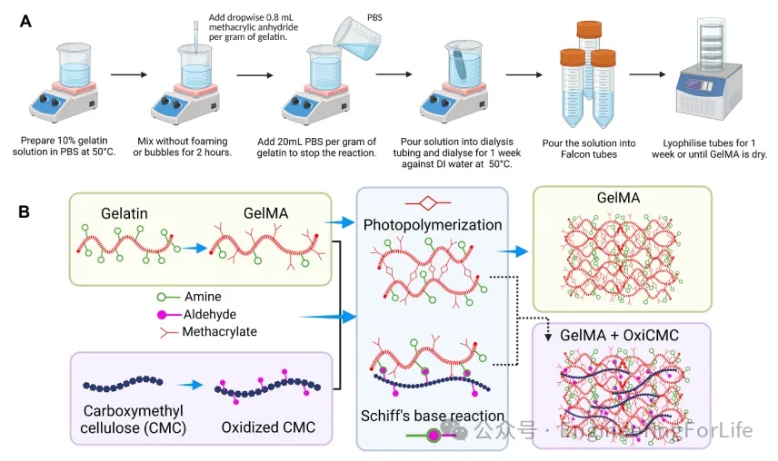 (1)CMC中的醛官能团与GelMA赖氨酸残基中的游离胺发生反应,通过席夫碱反应形成亚胺键(C=N);随后,暴露于紫外光下,通过水凝胶中的光引发剂启动光聚合过程,从而形成双IPN。