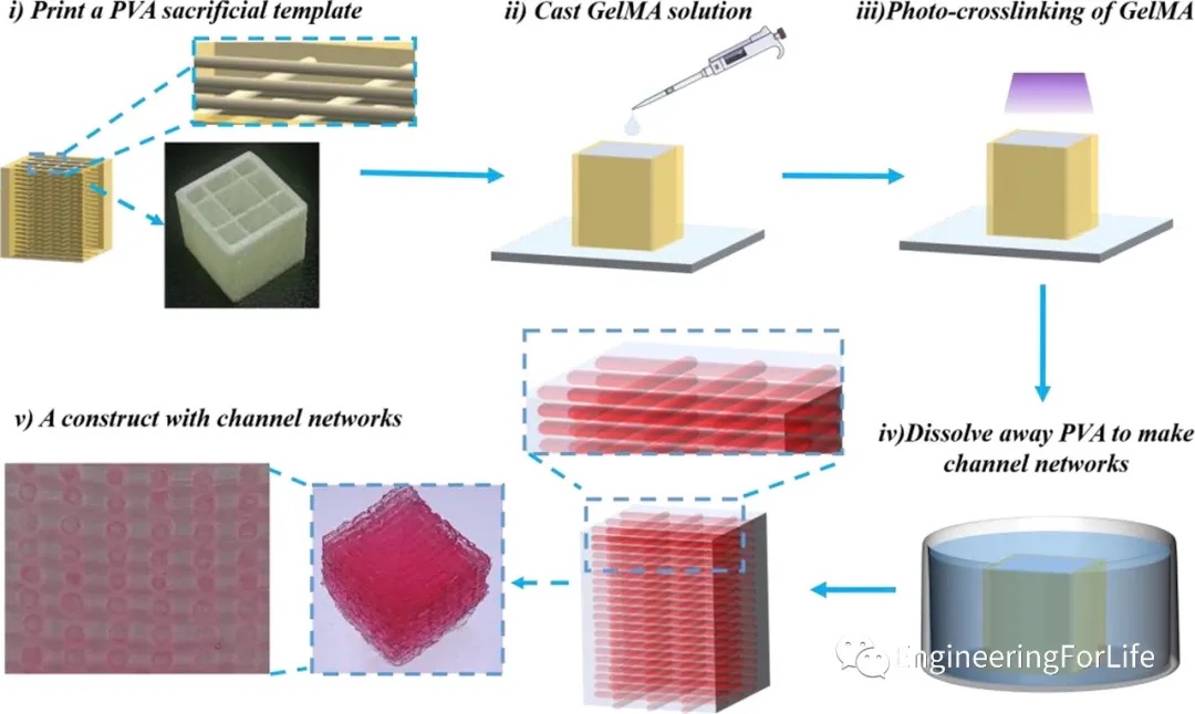 具体来说,首先使用3D打印机将PVA打印为牺牲模板。然后浇铸GelMA溶液以包封牺牲模板,并进行光致交联。最后,牺牲模板被溶解以形成通道网络。作为牺牲材料,PVA具有几个优点,i)友好的溶解速率便于后期的浇铸操作;ii)