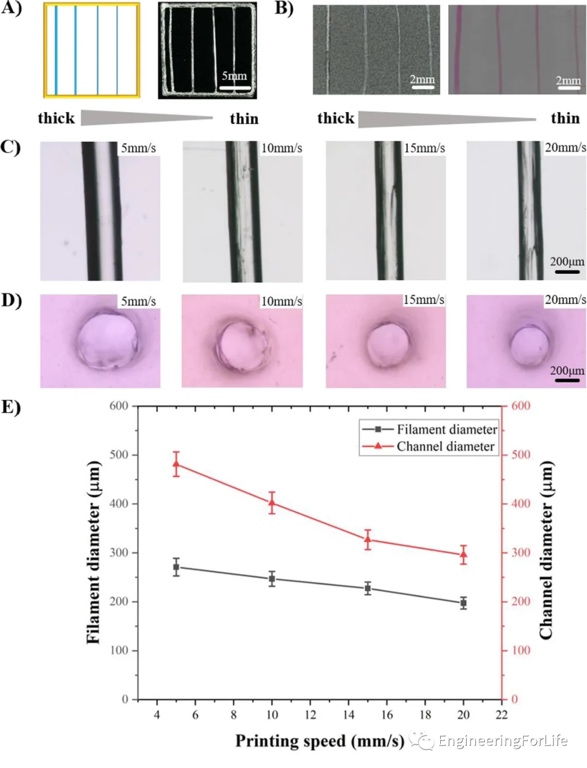 由于通道直径和通道密度对营养物/氧气传输有很大影响,因此作者首先研究了印刷速度对PVA细丝/通道直径的影响,以及PVA牺牲模板的填充速率。实验中构建了一个单层结构,通过改变印刷速度来实现直径梯度。从实际印刷中可以看出,印刷的单层结构具有明显的直径梯度,相应的通道也具有明显的直径梯度(图2)。在溶解PVA牺牲模板的过程中,PVA细丝会膨胀,从而增加通道尺寸和整个结构的营养/氧气渗透性。