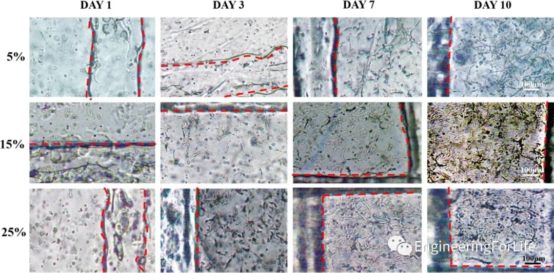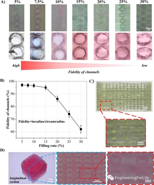 随着填充率的增加,通道的保真度下降,当填充率超过15%时,保真度急剧下降。此外,牺牲模板的纵剖面显示细丝具有较高的圆整度,相邻层的细丝相互连通,为构建连通的通道网络提供了保证(图4c)。溶解PVA模板后,纵向截面图像显示相邻层的通道相互连接以促进营养物/氧气的输送(图4d)。