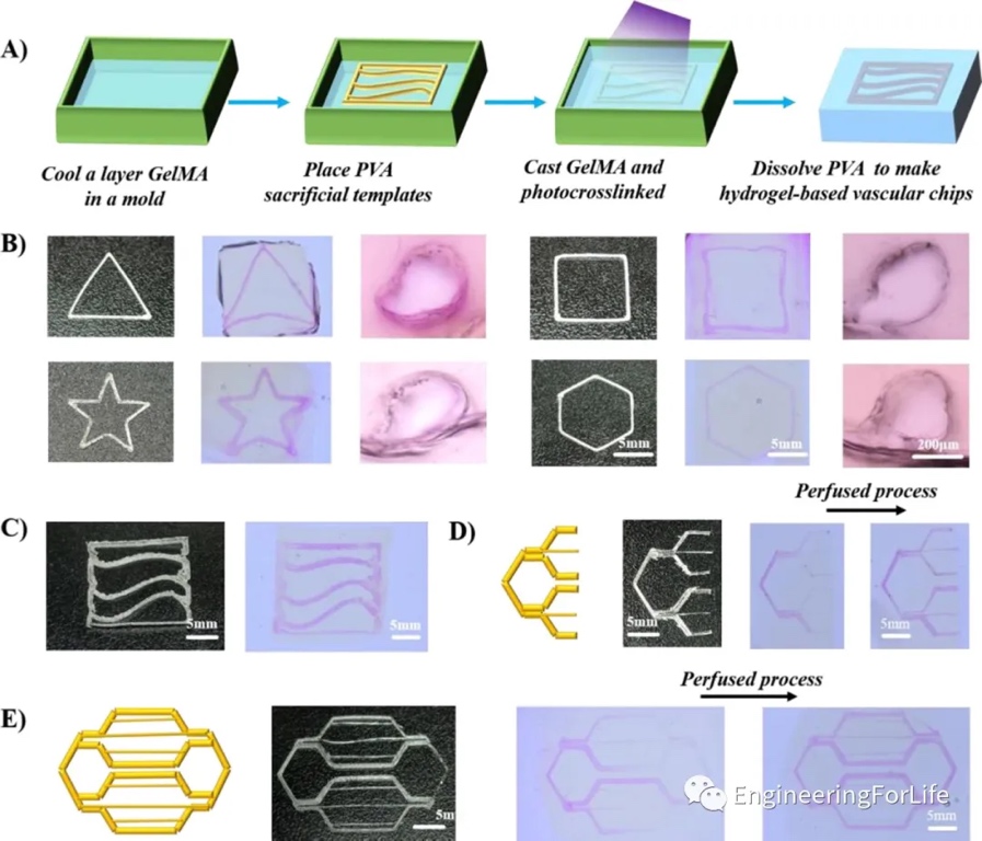 为了验证我们的方法可以构建自由形式的基于水凝胶的血管芯片,印刷不同形状的PVA牺牲模板用于制造自由形式的通道图案,包括三角形、四边形、五角形、六边形等。用染色的PBS溶液灌注证明了通道的可行性,表明其在制造自由形式通道图案的策略在血管芯片上具有非常可行的应用潜力。