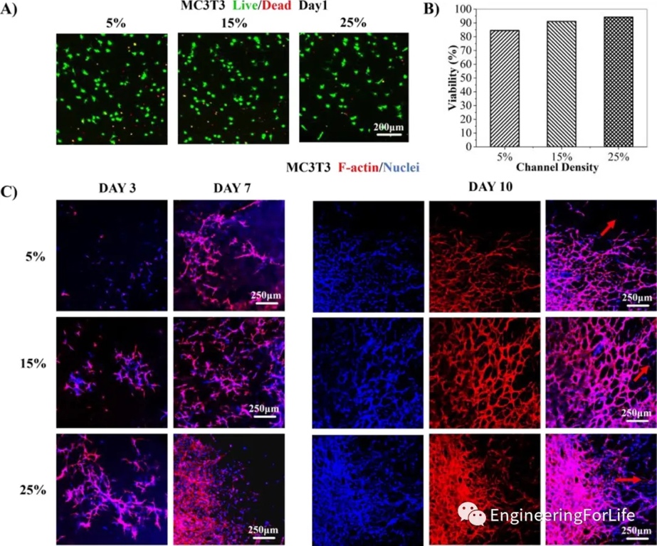 之后,作者进一步制造并培养了具有不同通道网络密度的细胞负载构建体。如图6所示,通道边界清晰,随着进一步培养,细胞逐渐拉伸连接形成网络。通道网络密度越高,细胞间的连接越紧密,表明营养/氧输送能力随着通道密度的增加而增加。