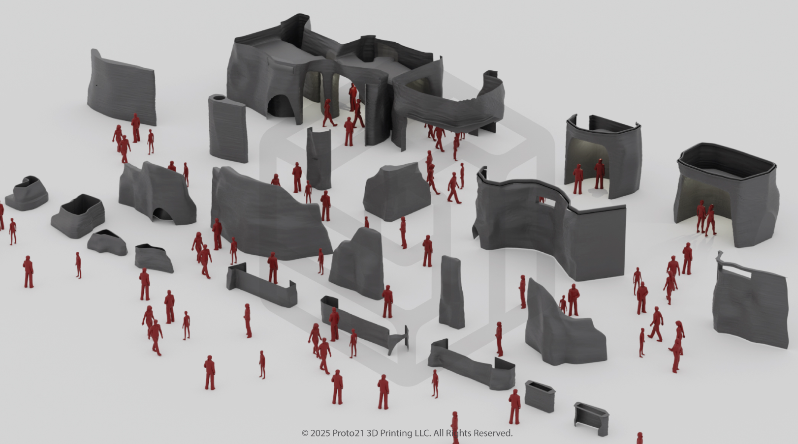 这23件雕塑作品的设计灵感来源于沙峡谷,其岩石般的几何形状和表面效果通过在3D打印上涂覆沙子纹理来实现。Proto21团队使用Blender软件手工创建每一个细节,确保最终成品中92%的3D打印部件都是独一无二的。通过手工制作,没有采用自动化或编码技术,旨在创造出非重复性的设计,以此模仿大自然的“鬼斧神工”。